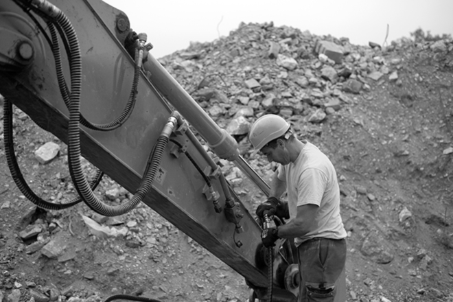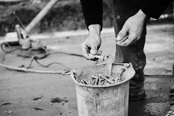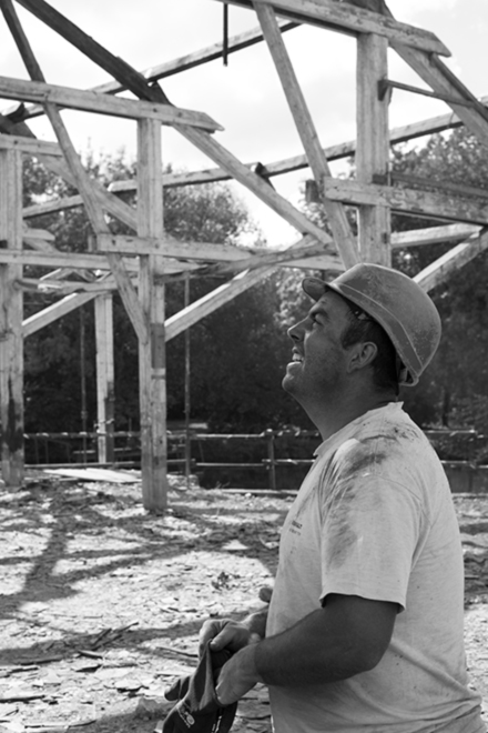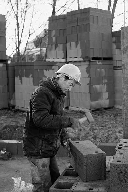 Le souhait du client a été tout d’abord été esthétique avec le choix du noir et blanc. Dans le type d’images, j’ai réalisé la fois des portraits (en action) et des vues d’ensemble des chantiers (architecture).